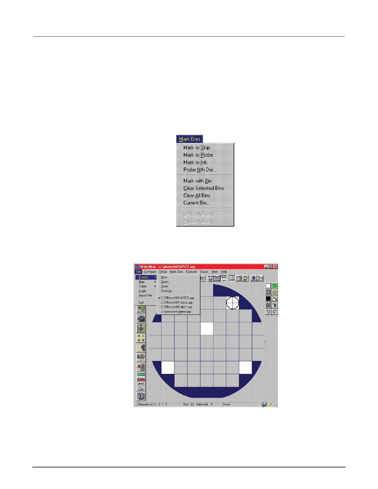 3. From the Mark Dies menu, use Mark to Skip and Mark to Probe to set dies. Click a die in the