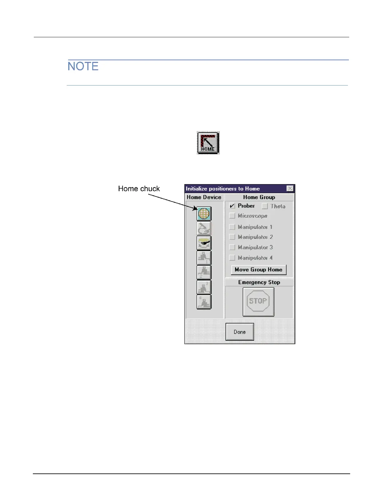 4. From the Initialize positioners to Home window, click Home chuck. The chuck moves to the back