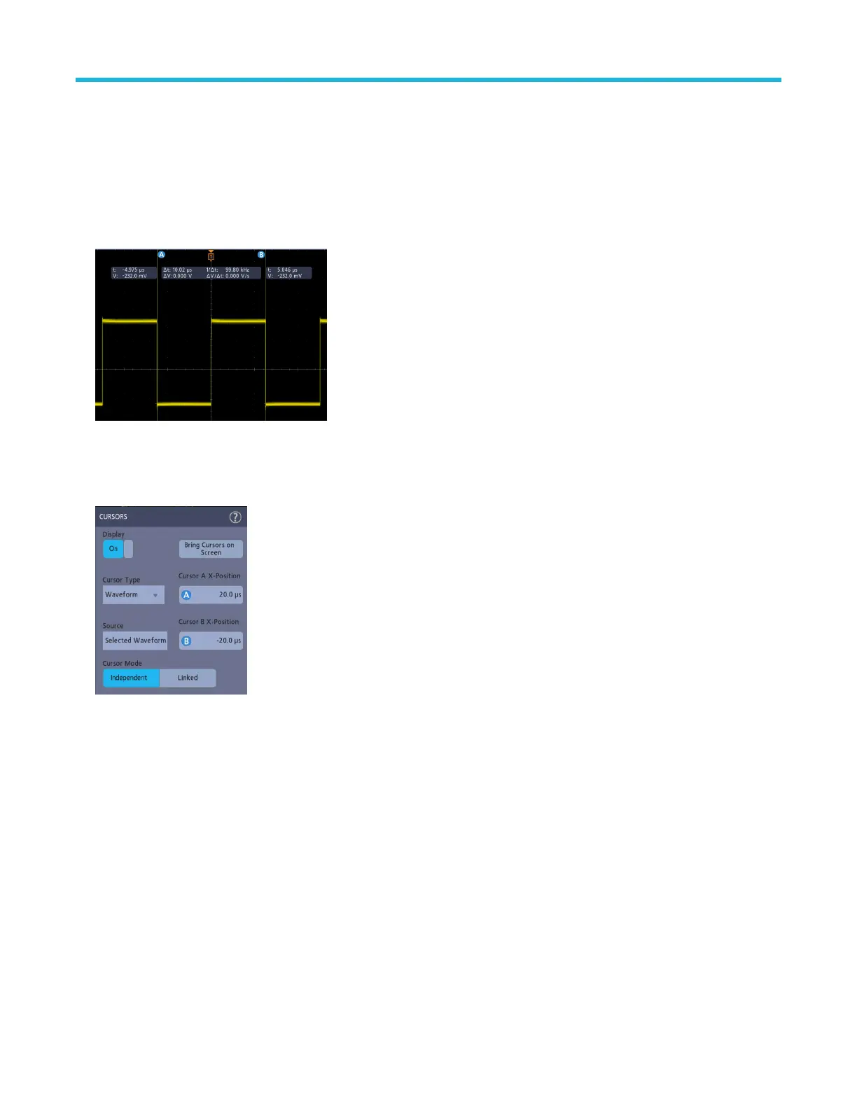 Cursors are on-screen lines that you can move to take measurements on specific parts of a waveform. Cursor readouts show both current