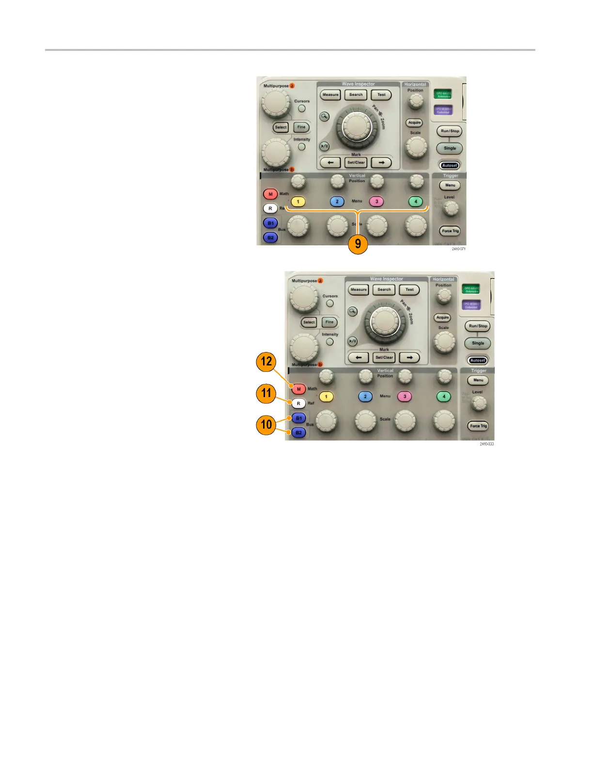 hese buttons and knobs control waveforms, cursors, and other data input.