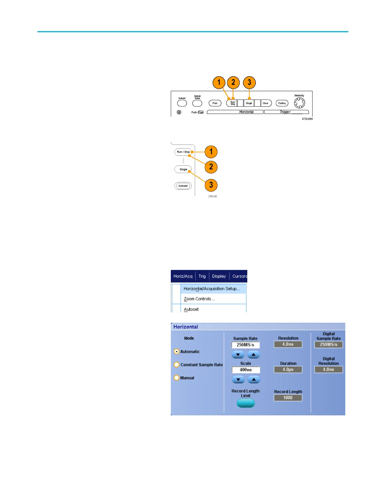 Tektronix MSO5034B - Starting and Stopping an Acquisition; Selecting the Horizontal Mode