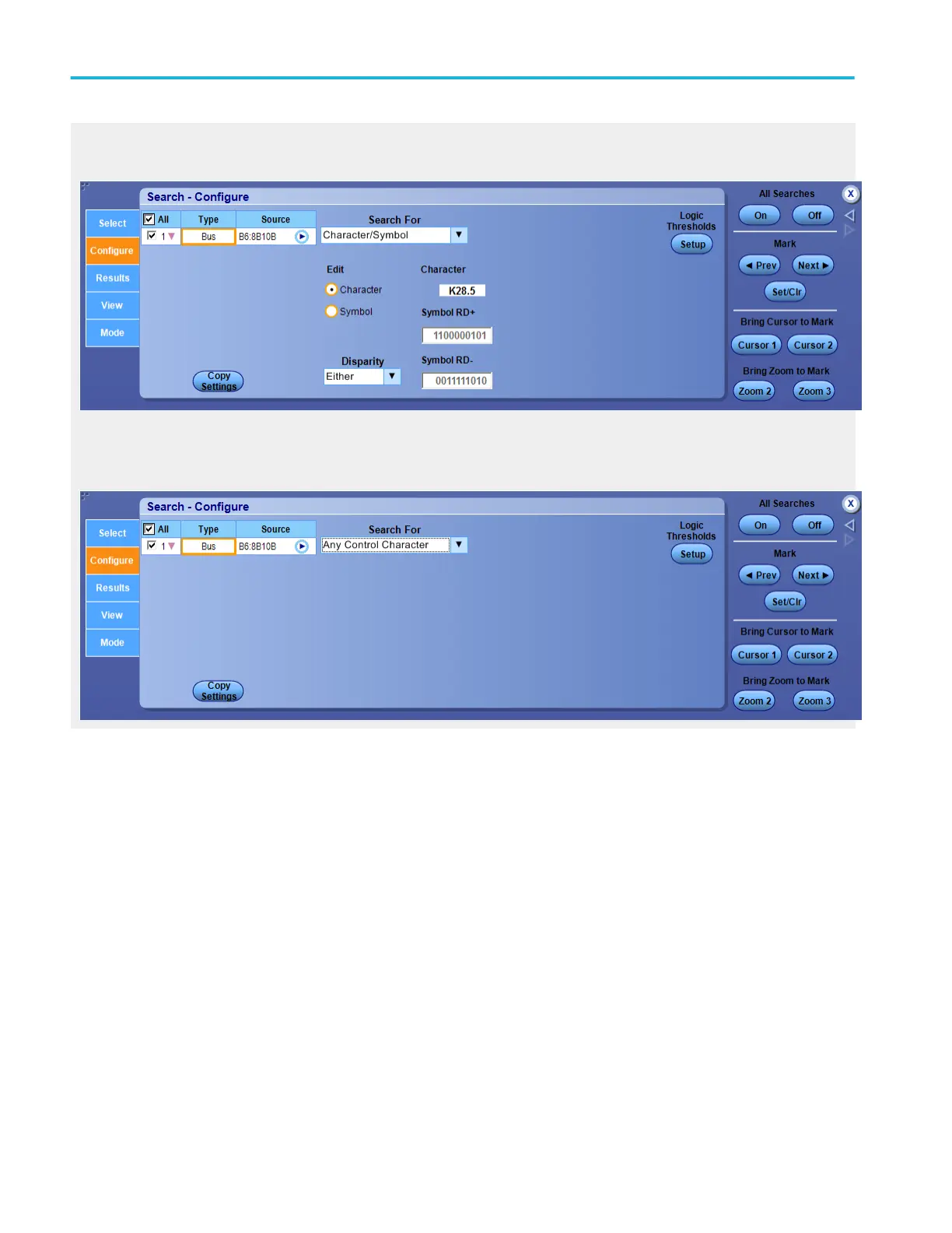 After setting up an RS-232 bus, go to the Analyze menu, select Search, and then select the Bus trigger type; then open the