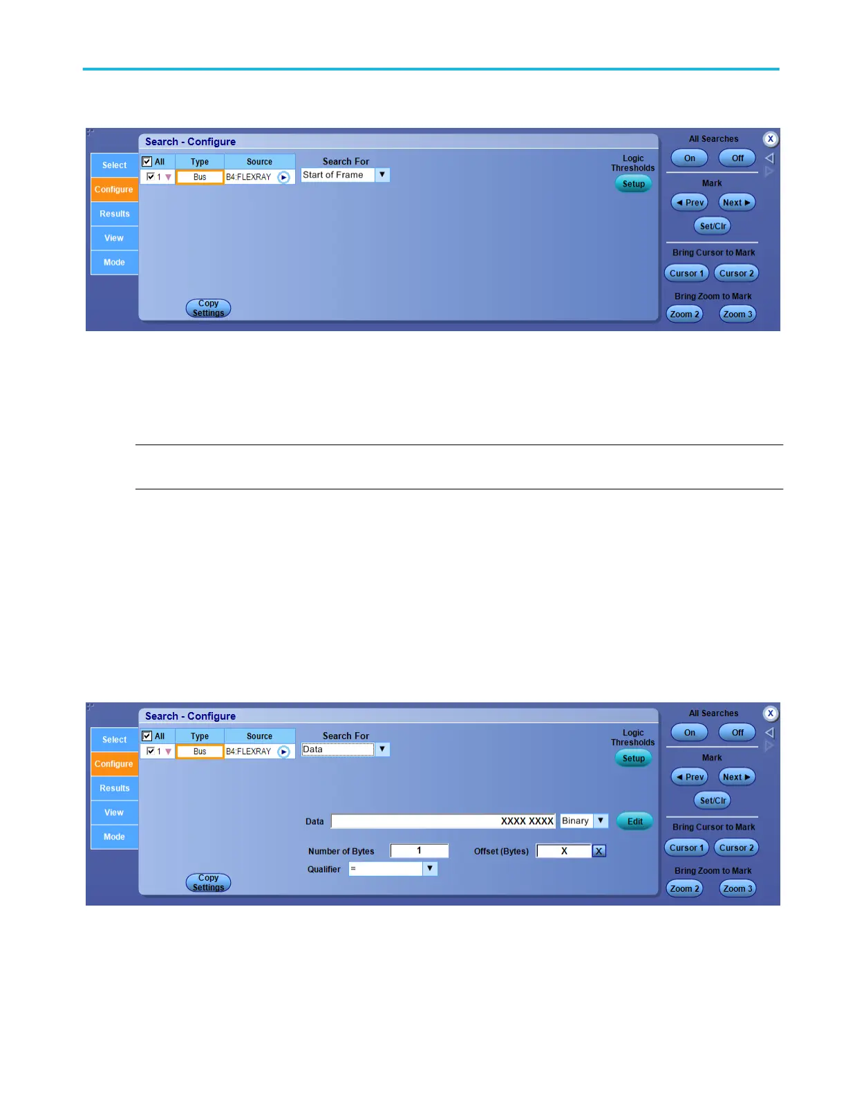 Click the Search For selections Indicator Bits, Identifier, Cycle Count, Header Fields, Ident & Data, End of Frame, or Error, to