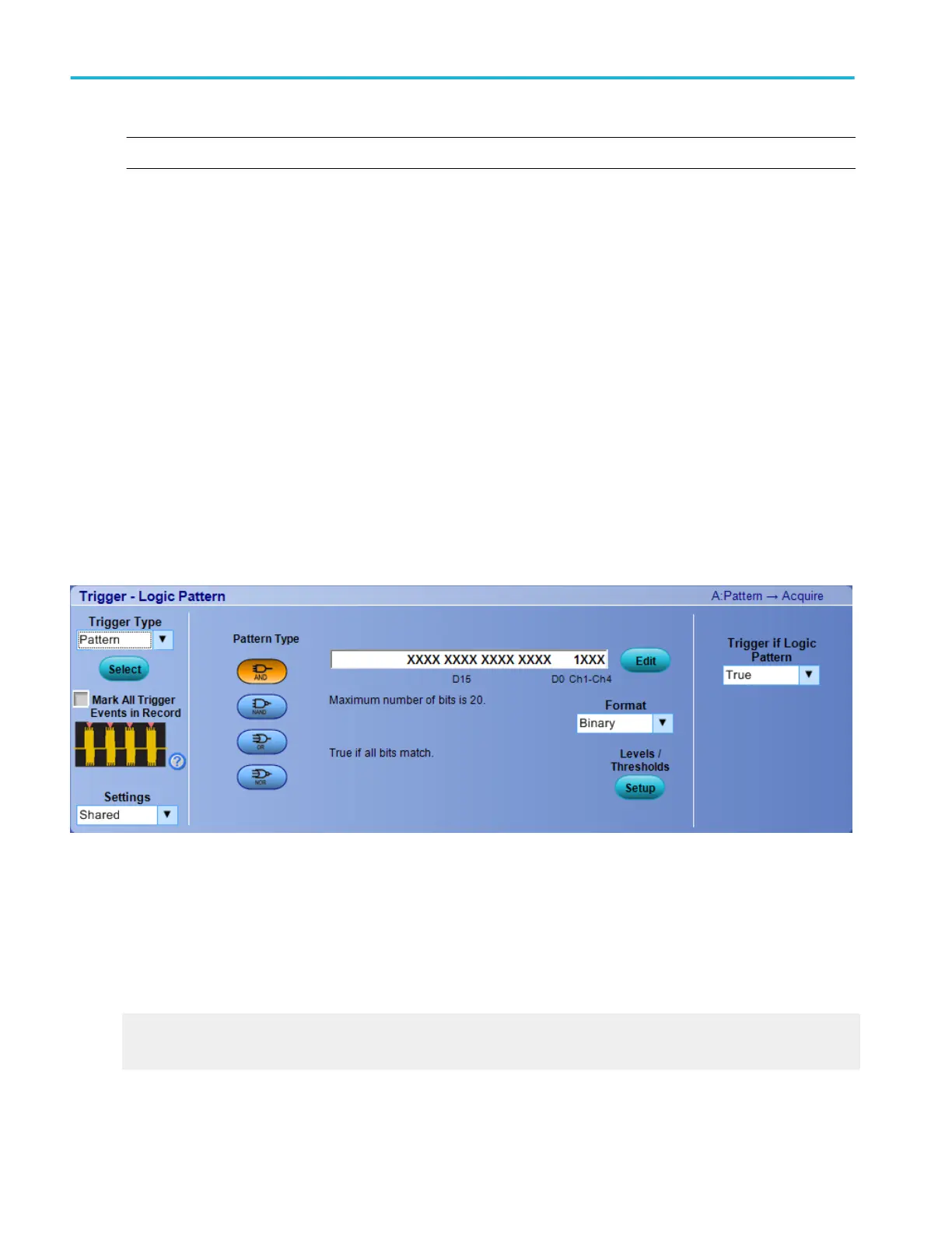 Overview. Use the controls in this window to set up the Logic Pattern trigger parameters.