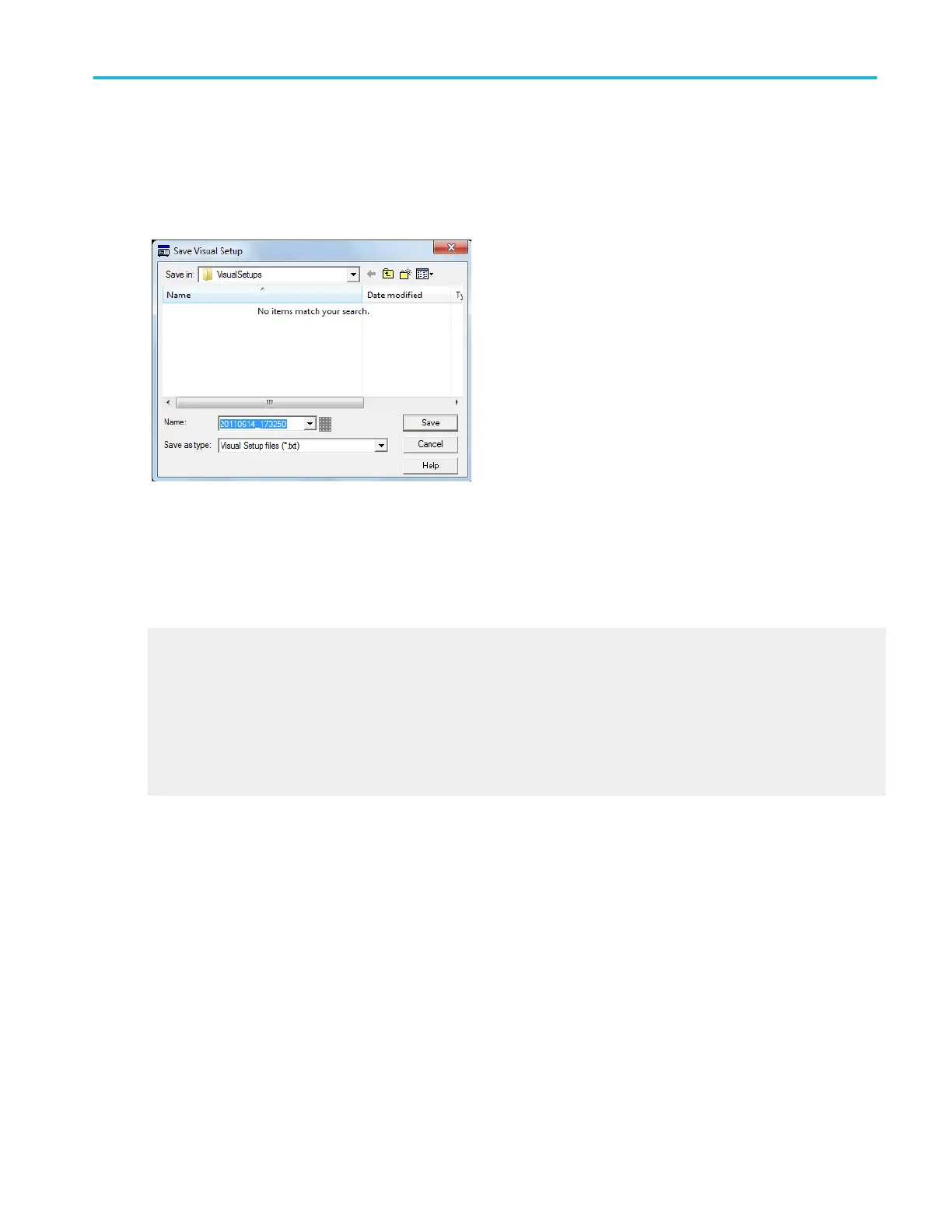 Overview. Use this dialog box to save Visual Trigger setups to a file for later use. The setup is stored in human-readable text in