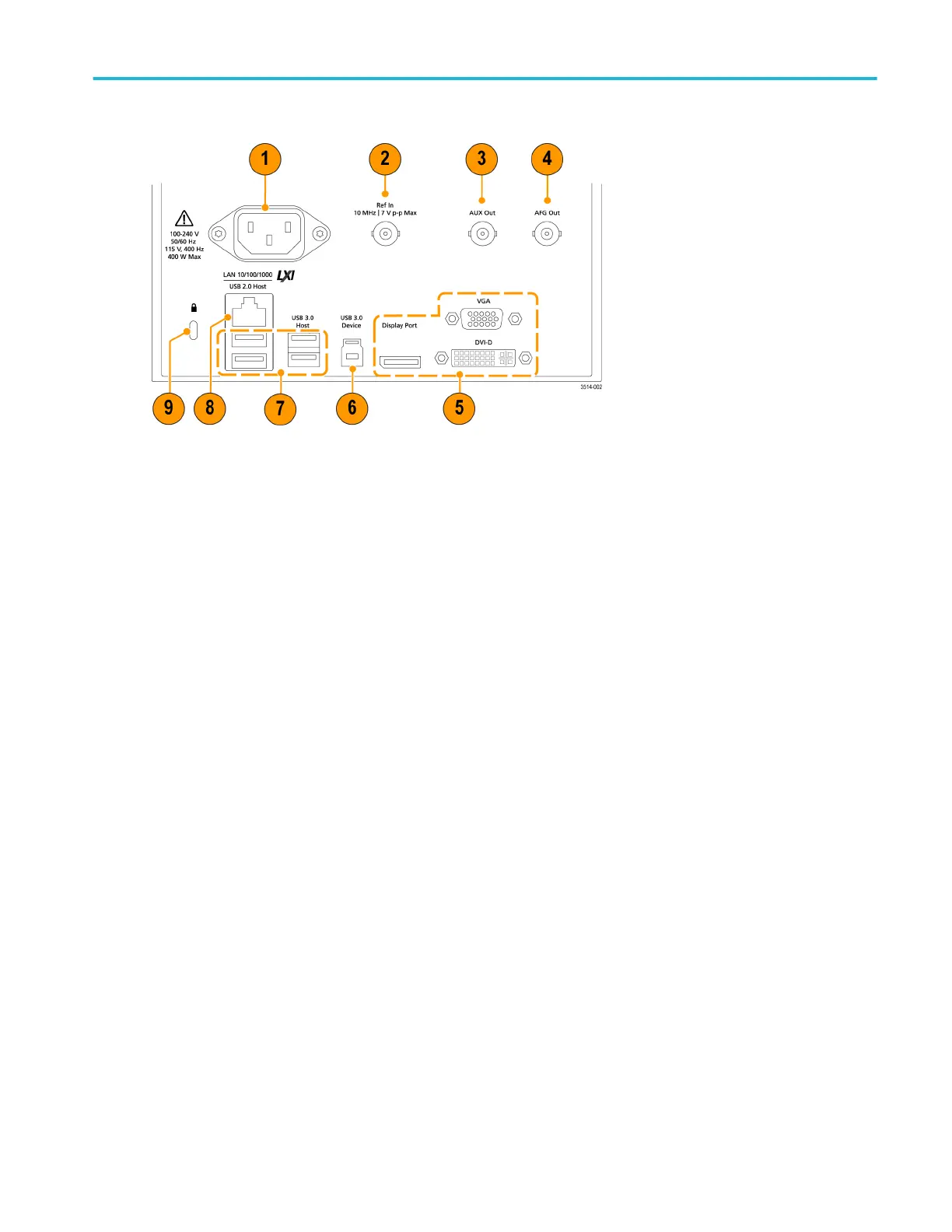 USB デバイス・ポート:USBTMC プロトコルを使用してオシロスコープを遠隔操作する場合に PC に接続しま