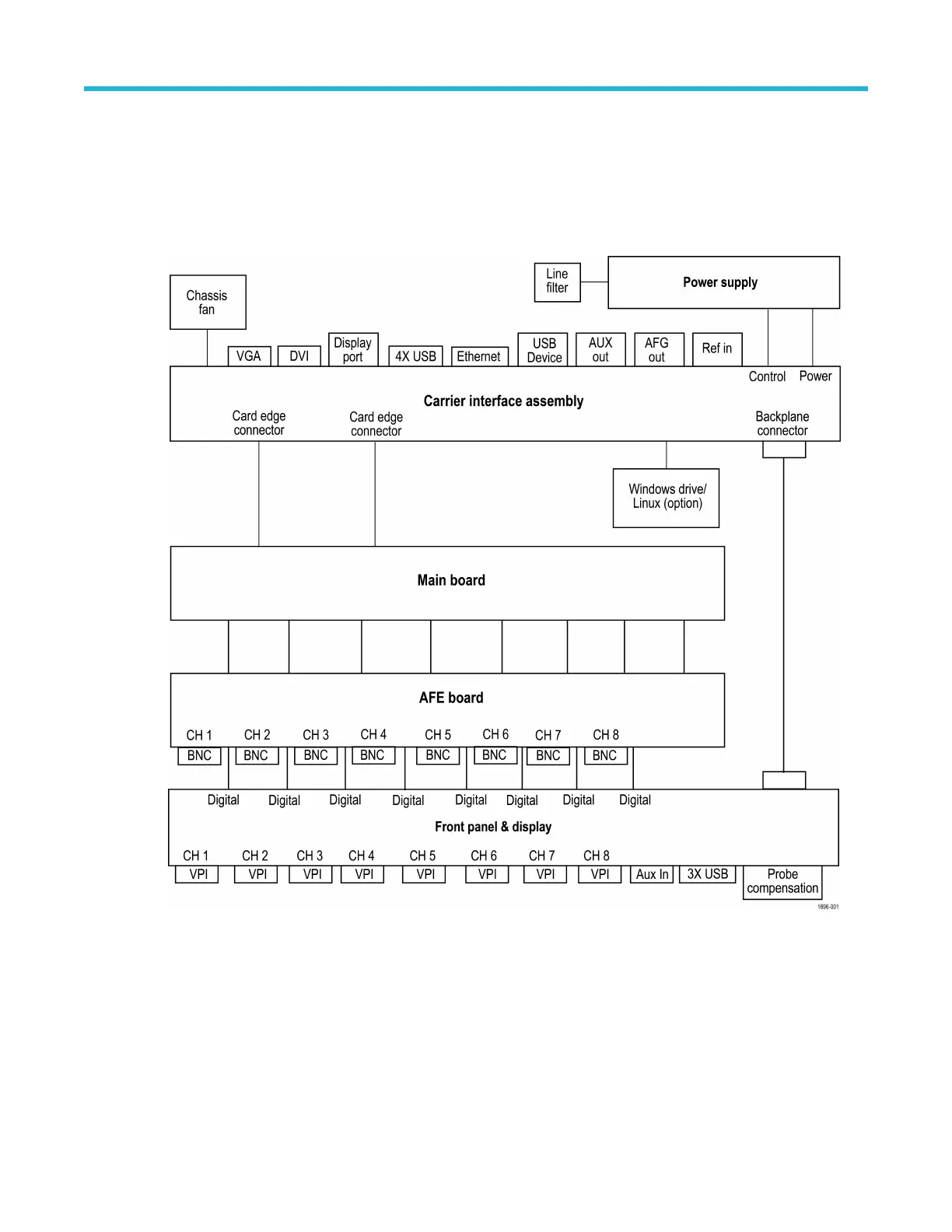 This chapter describes the electrical operation of the oscilloscope to the module level. The block diagram shows the