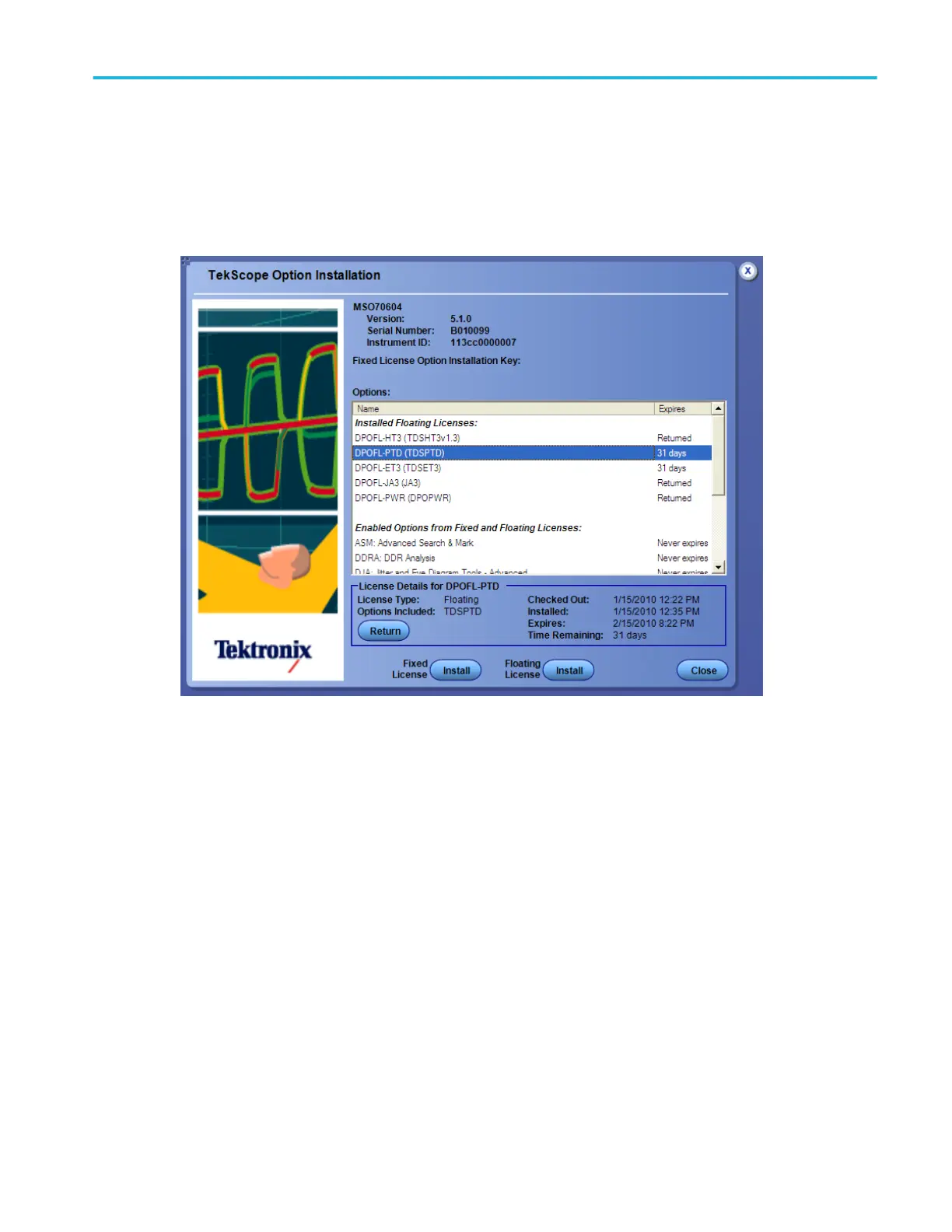3. Select the Option (for example DPOFL-PTD (TDSPTD)) in the Tekscope Option Installation dialog box and click the Return