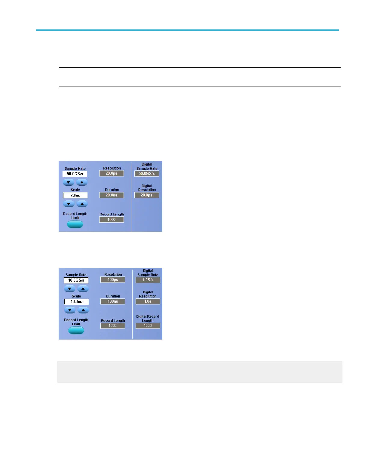 From the Horiz /Acq menu, you can view the Digital Sample Rate and Digital Resolution of logic waveforms. The values track the
