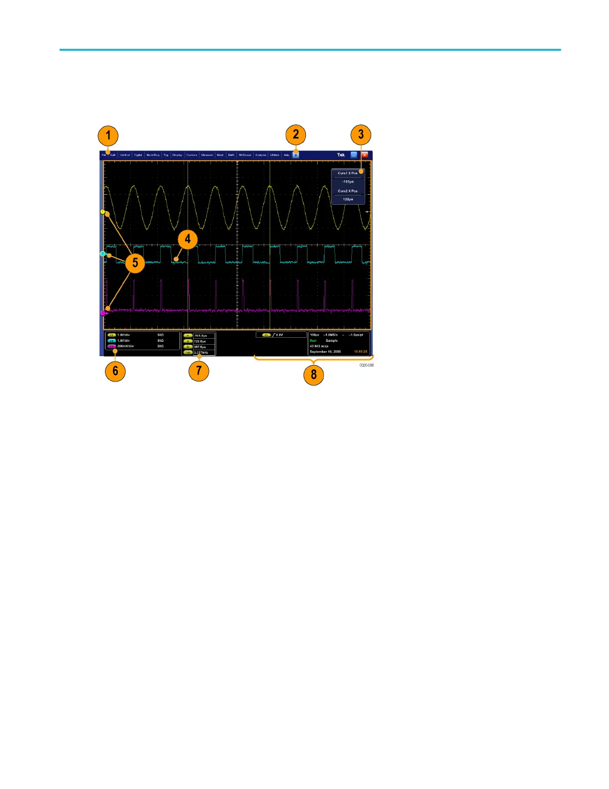7. Readouts: Display of cursor and measurement readouts in this area. You can select measurements from the menu bar or
