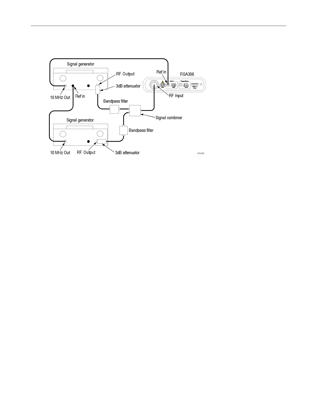 Set up the RF signal generators, band-pass filters, signal combiner, and RSA306 as shown.