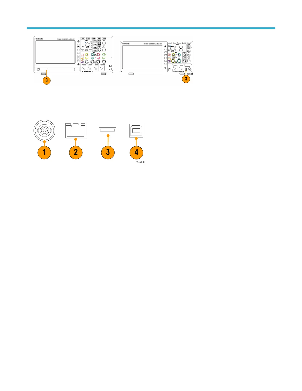 3. USB 2.0 主机端口。标准 USB 主机端口可让您以无线连接方式(Tektronix TBS2000B 系列独有功能)连接 USB Wi-Fi