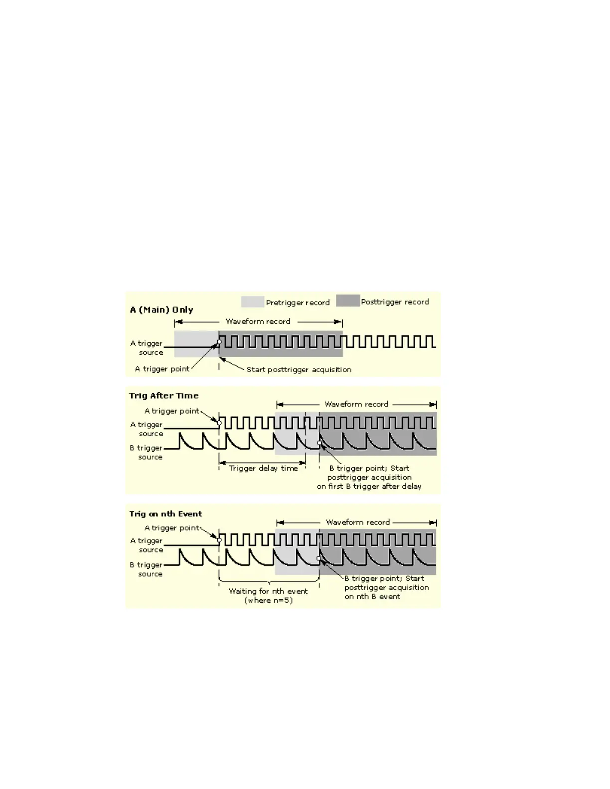 The following figure compares the sequential trigger choices A Only, Trig After Time, and Trig
