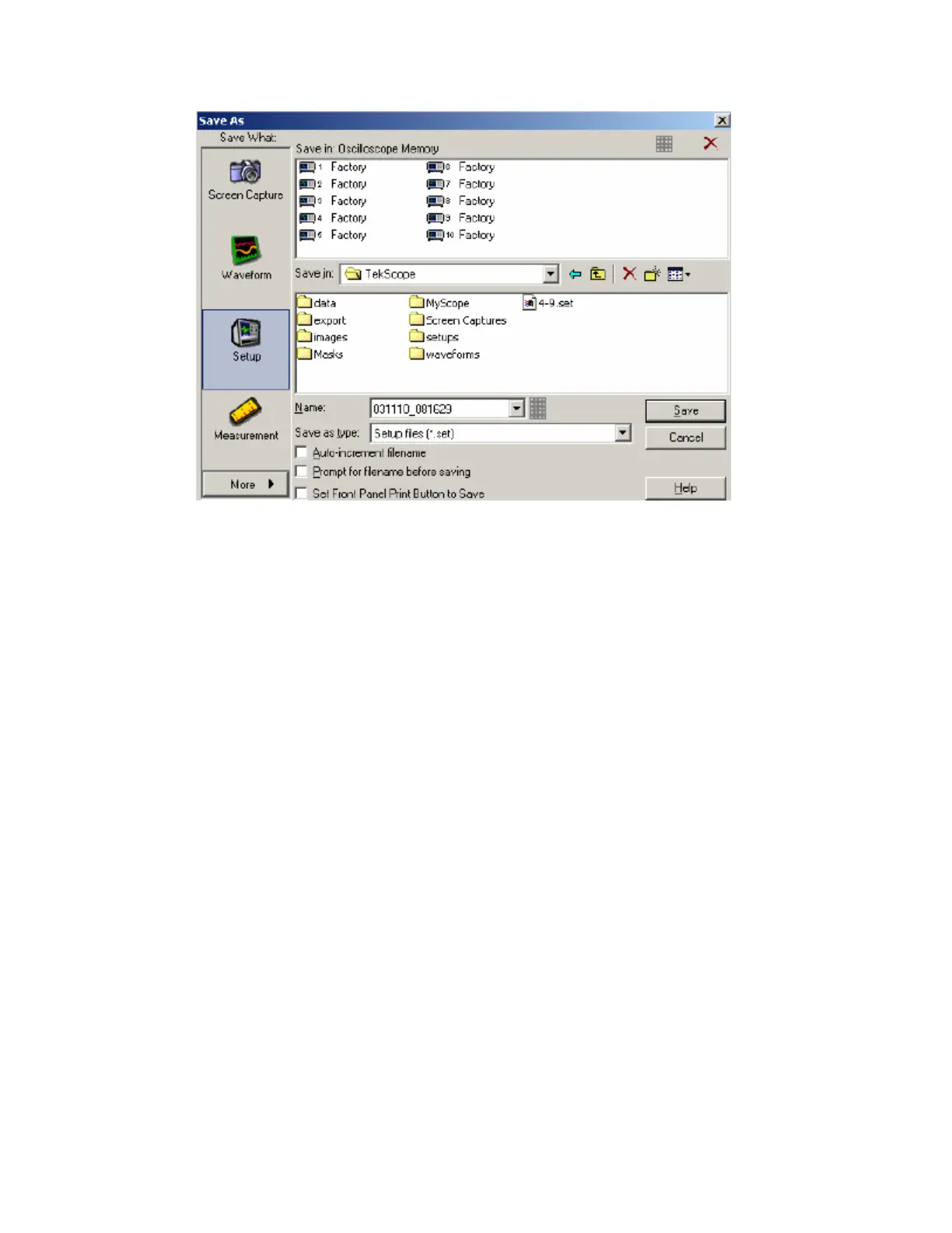 named. Click one of the icons under Look in Oscilloscope Memory, and then click Recall to