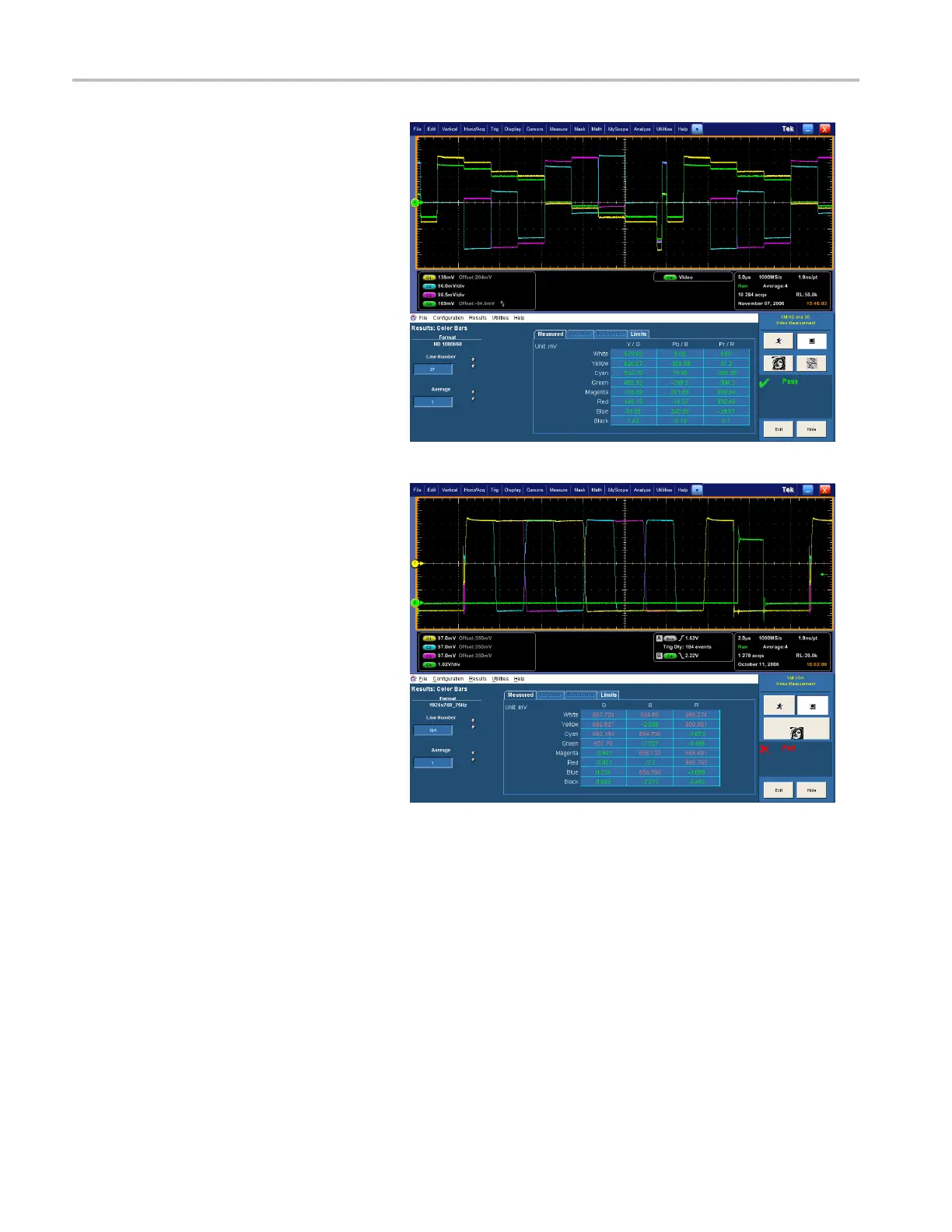 Green text indicates pass (the measured
