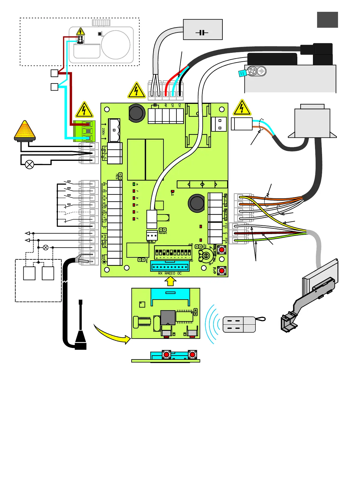 5) Alle NORMALERWEISE GESCHLOSSENEN Kontakte (Fotozellen, Endanschlag, feste Schwelle und Stop), welche in der