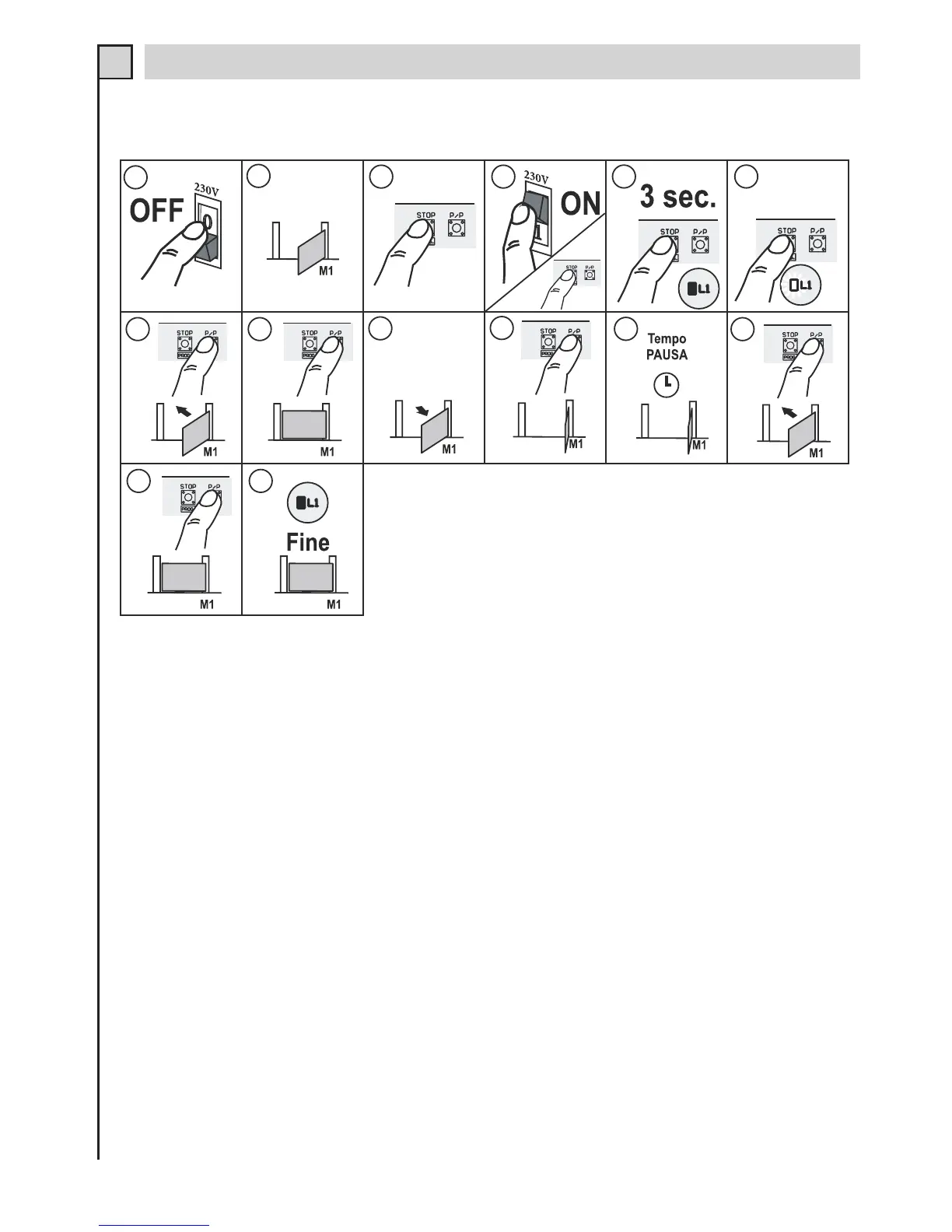 13 en 14 - Zodra de poort helemaal dicht is, drukt u op P/P. De motor stopt en de led L1 gaat uit.