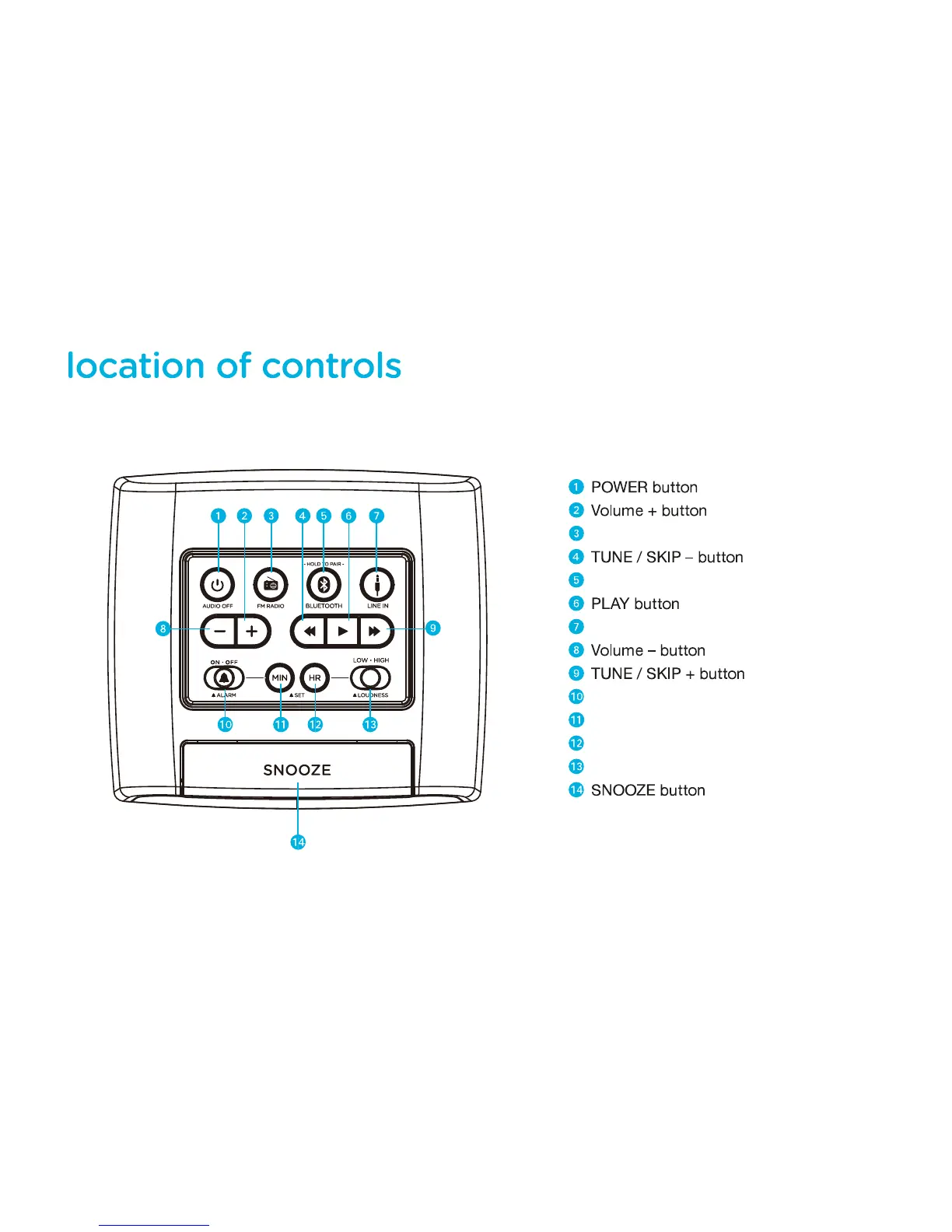 TeleAdapt TA-7850 - Location of Controls; ALARM ON-OFF switch; ALARM SET MINUTE button; ALARM SET HOUR button