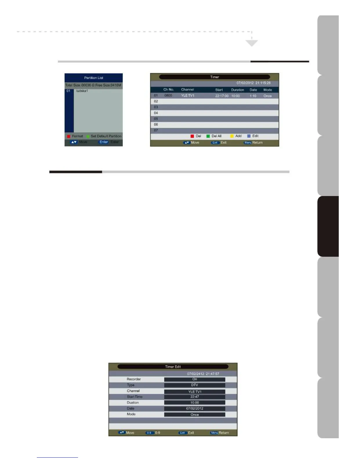 Press the RED button to format the partition of interest and the GREEN button to set the partition of interest as the default
