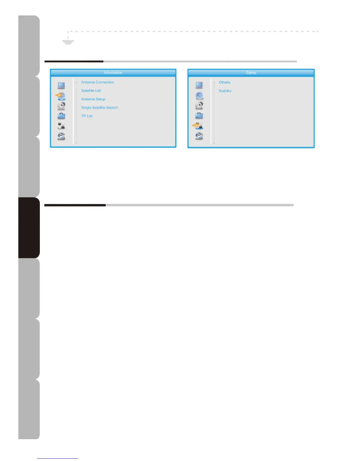 Allows you to set up a variety of features: Antenna Connection, Satellite List, Antenna Setup,