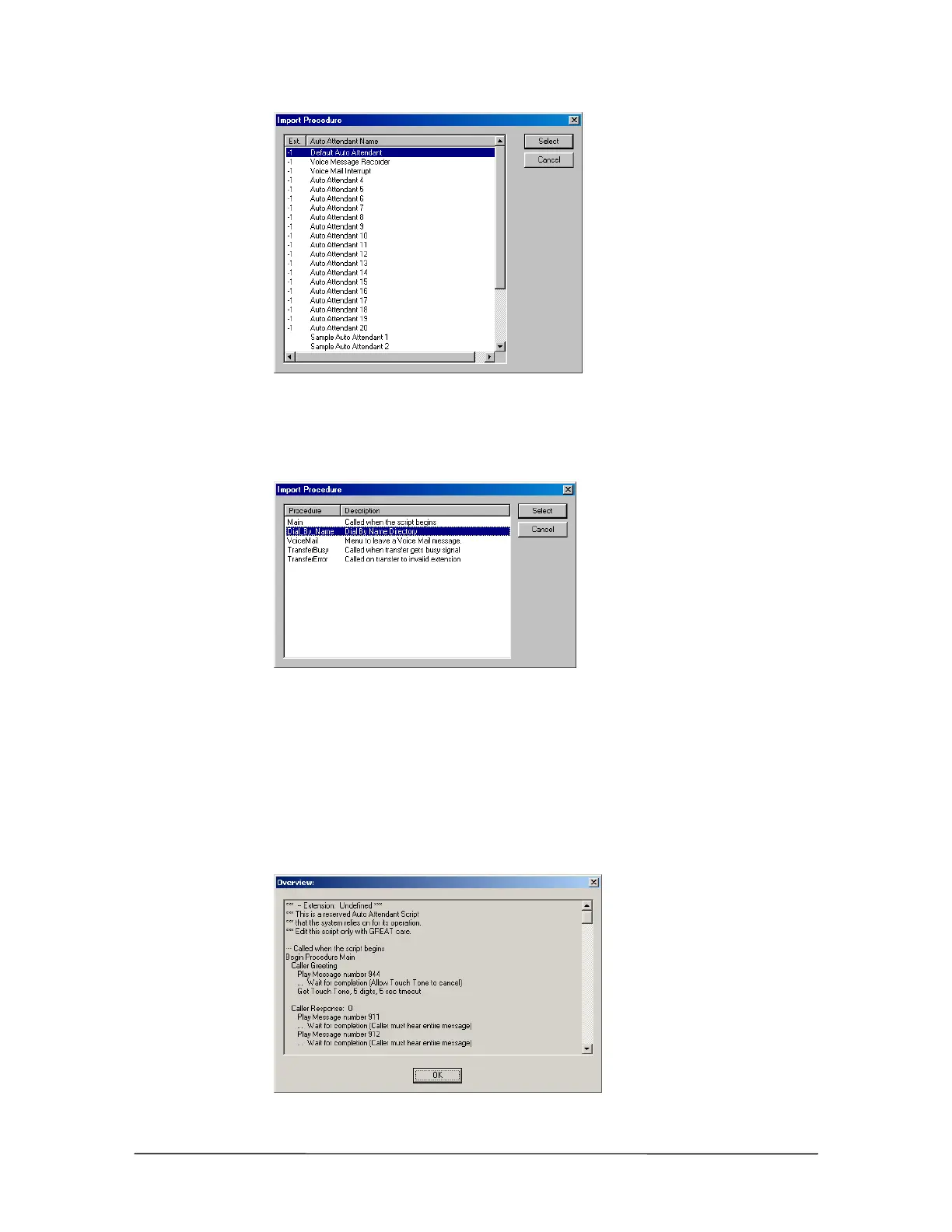 • The Import Procedure dialog box displays the Procedures for the Auto Attendant.