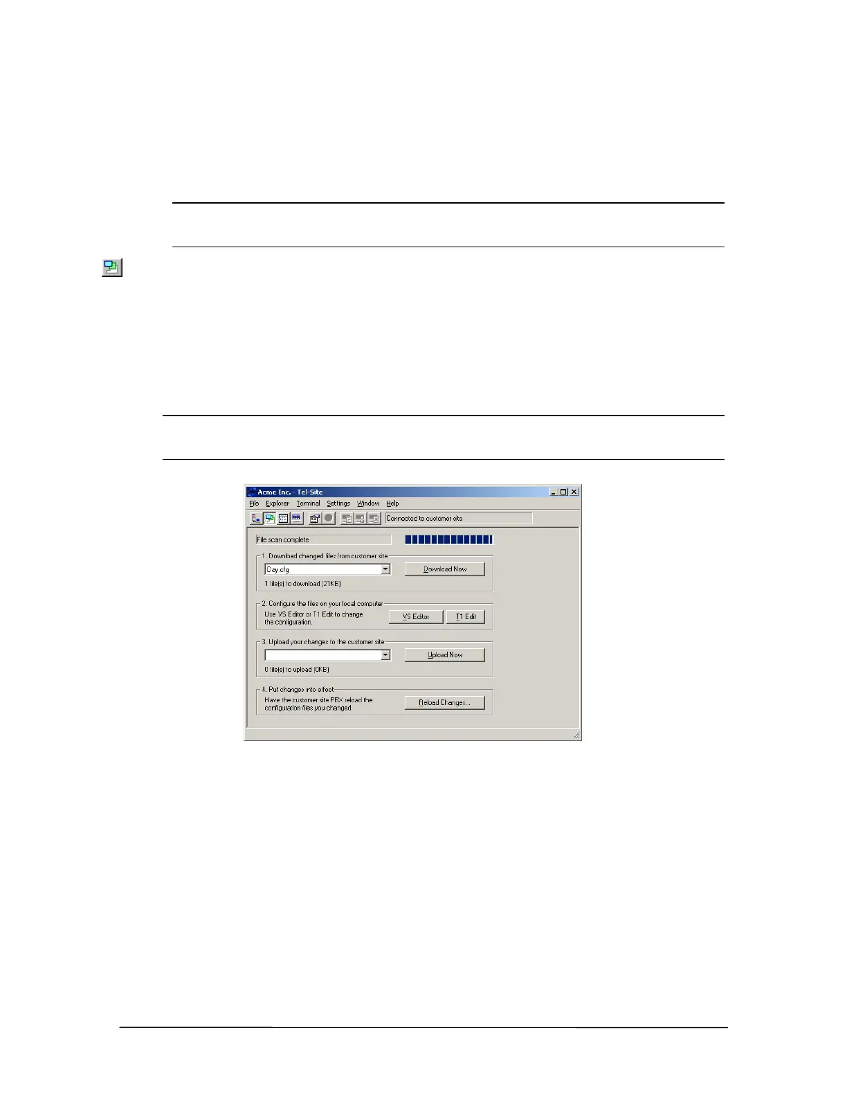 Configuration changes are performed on copies of site files on the Tel-Site computer. After any