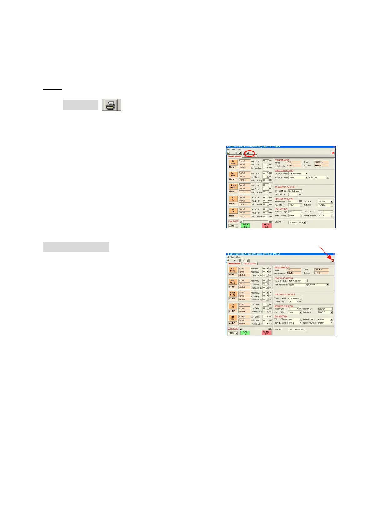 Telecrane F25 - Software - Print and Exit; Printing Software Screens; Exiting the F25 Program