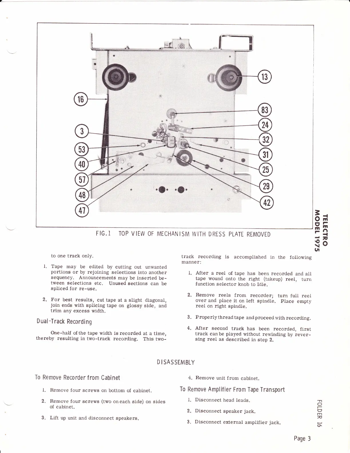 Telectro 1975 - Disassembly; To Remove Recorder from Cabinet; To Remove Amplifier From Tape Transport