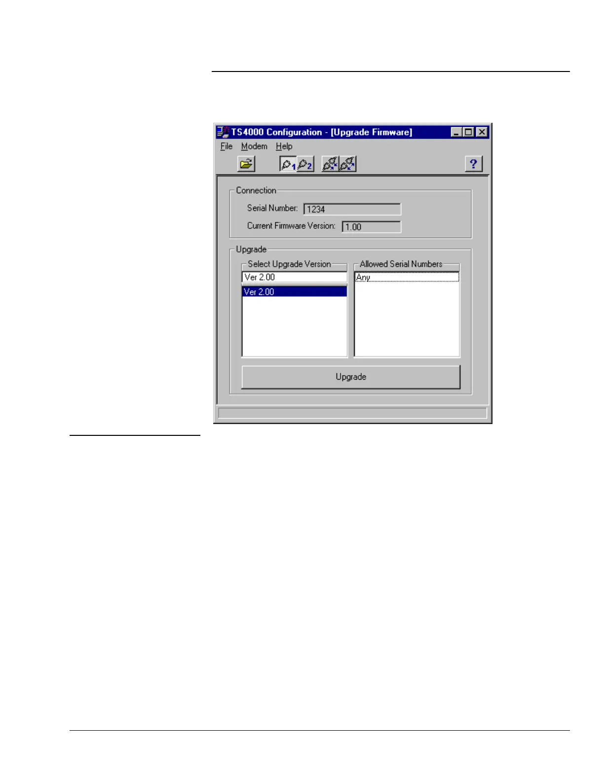 4) Press the Connect to Modem button to connect the upgrade program to the