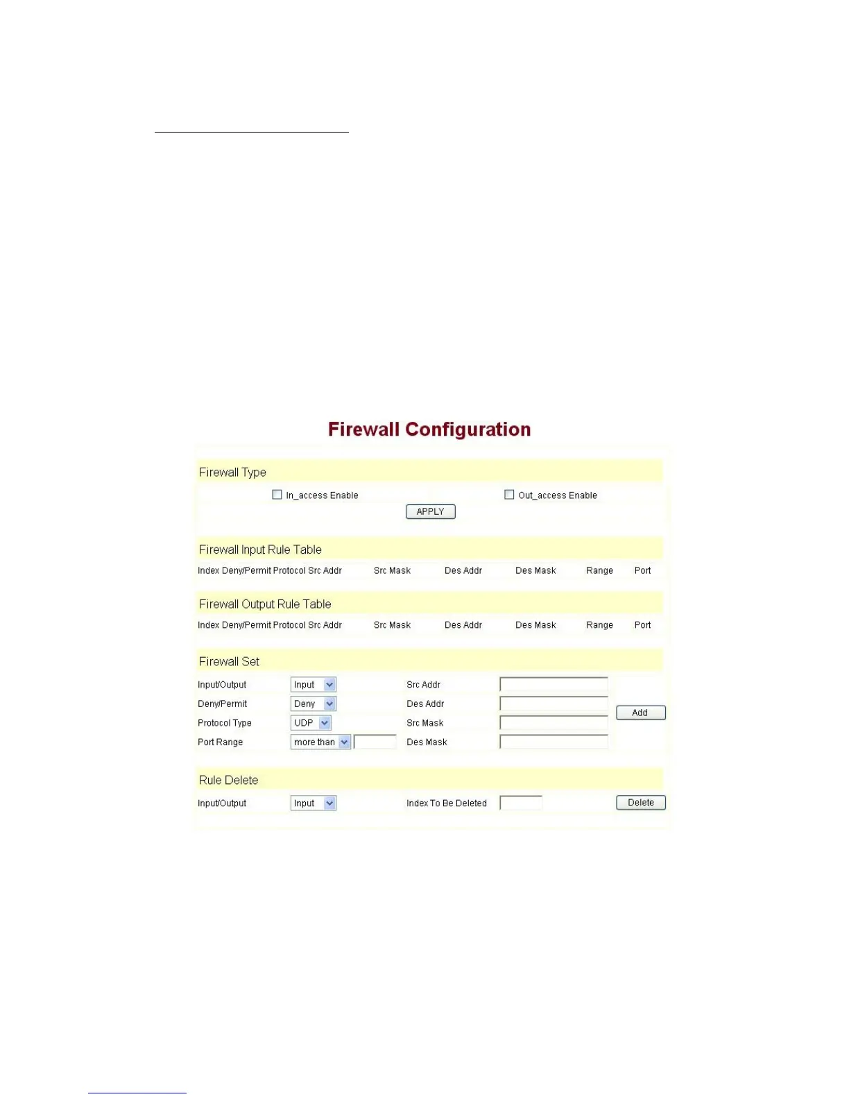 Firewall setting page. User may set up firewall to prevent unauthorized Internet