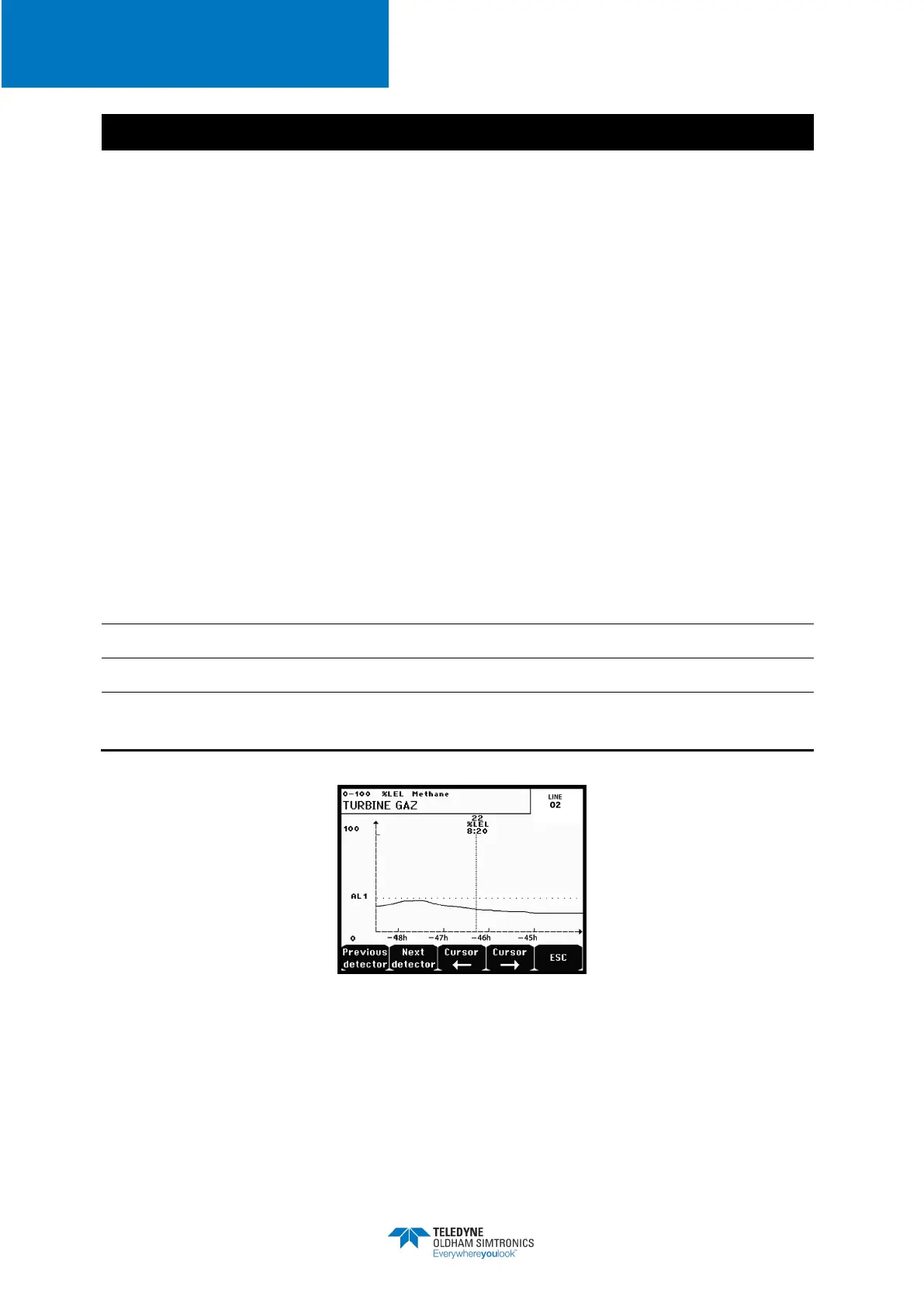 indication of alarms, value of current measurement with unit and gas detected). Use