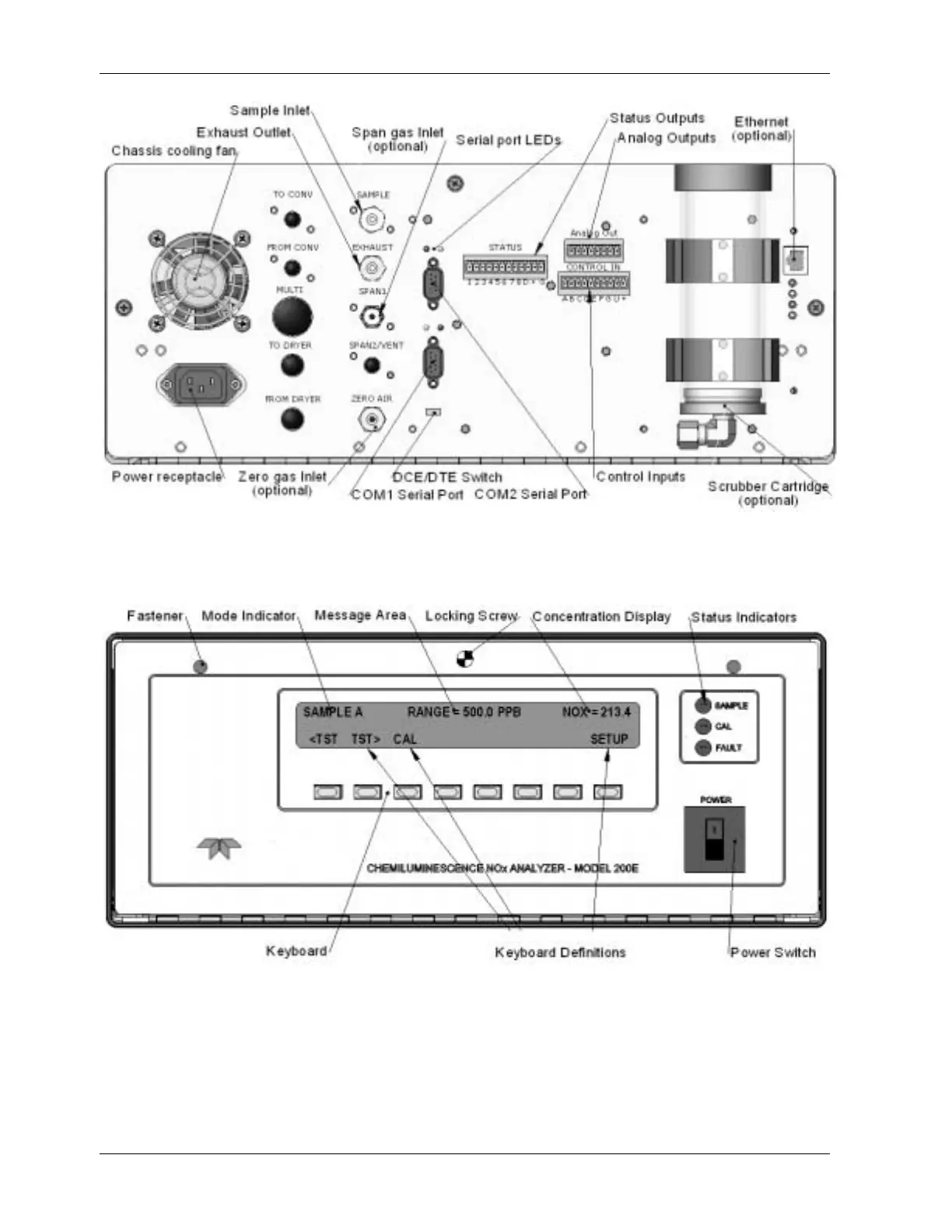 Teledyne 200E - Figure 3-3: M200 E Rear Panel Layout; Figure 3-4: M200 E Front Panel Layout