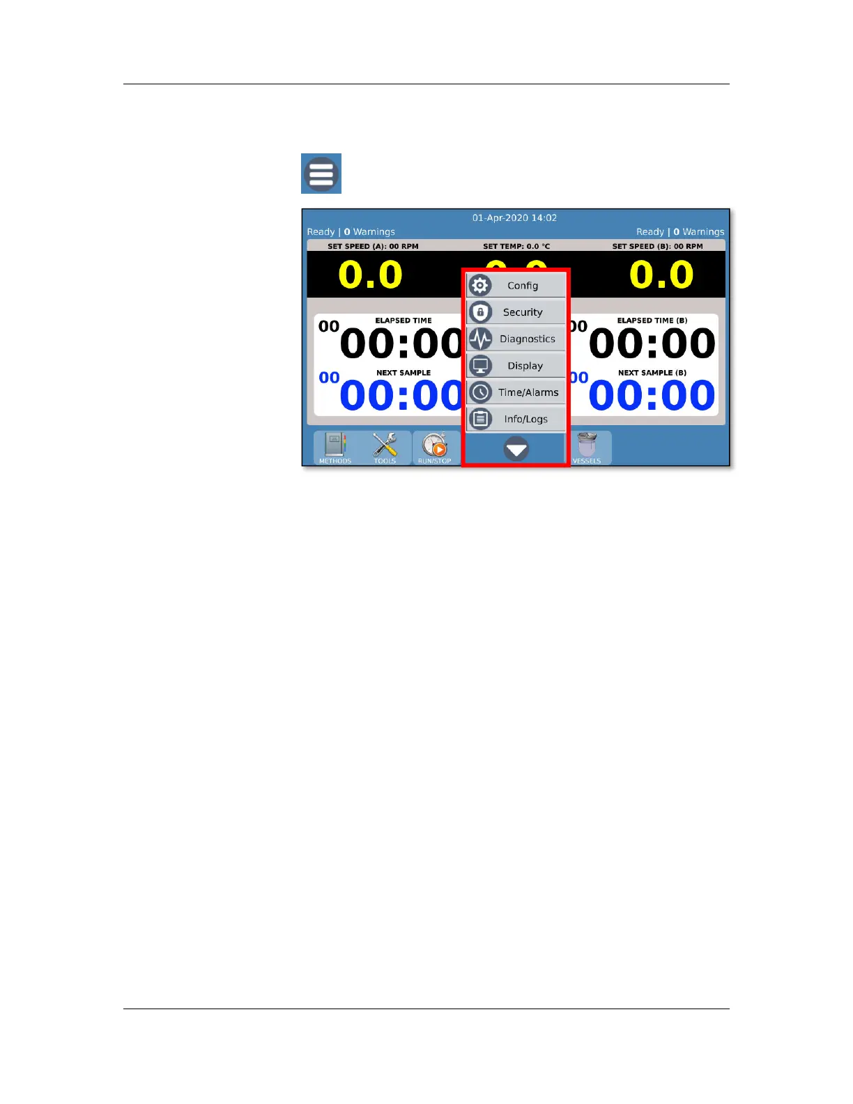 Config: View/edit instrument configuration, labels, accessories.