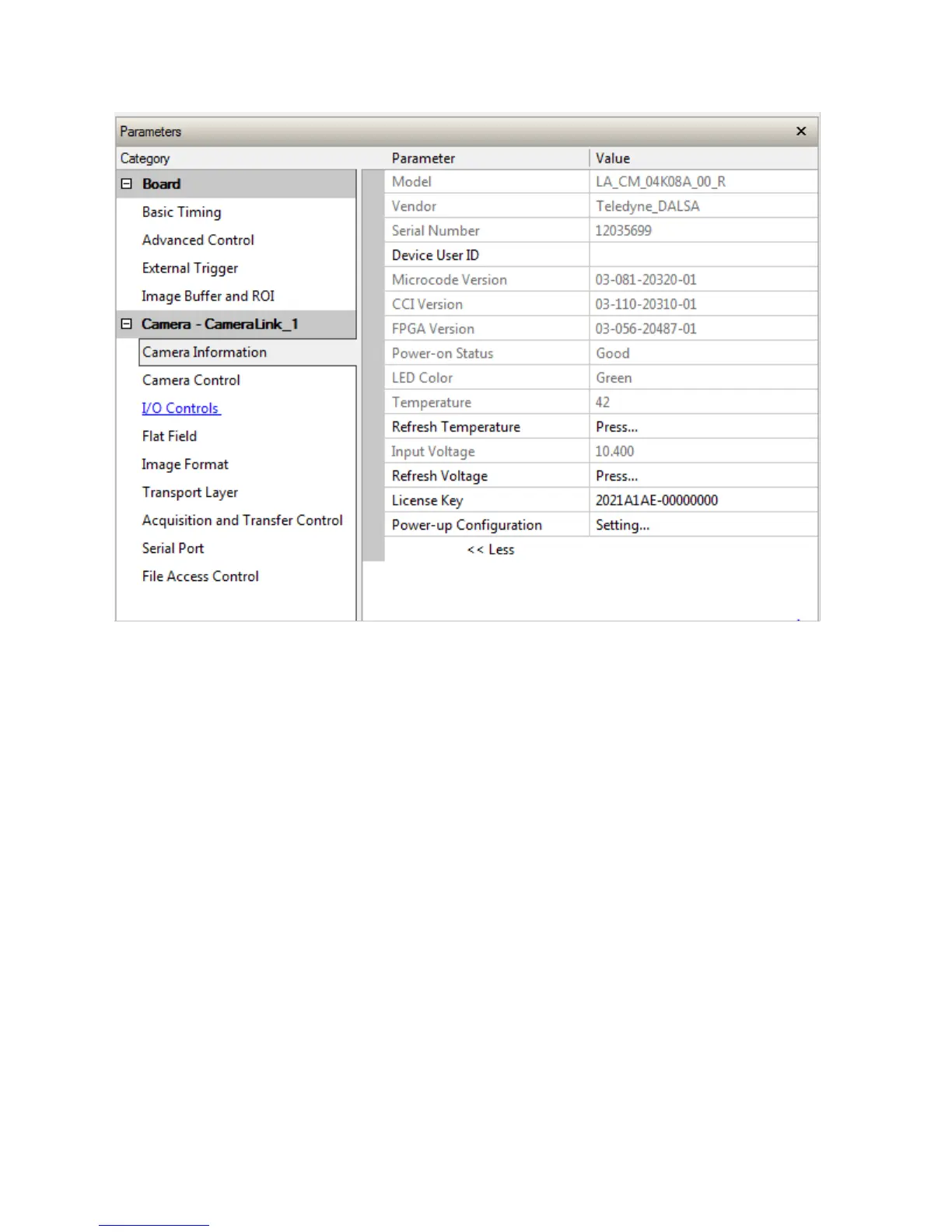 Figure 7. CamExpert GUI showing connected camera