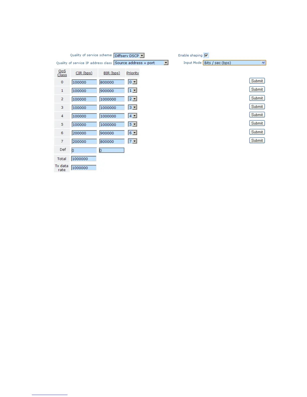 Figure 7-13 Traffic Shaping Configuration Screen using IEEE 802.1p Priority Tags