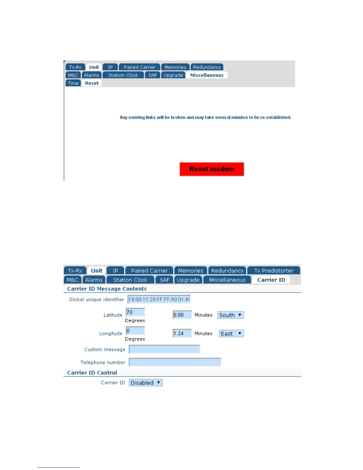 The Edit->Unit->Carrier ID screen is shown in Figure 6-21. This allows a low-power