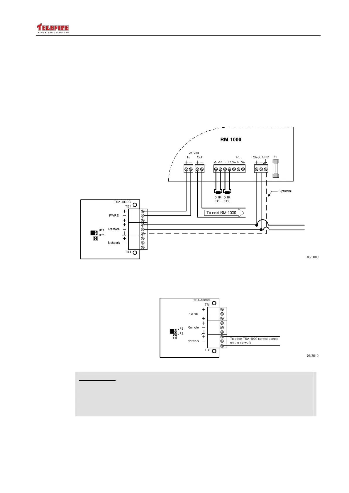 RM-1000 remote panels are connected to the control panel via 4-wire connection. One