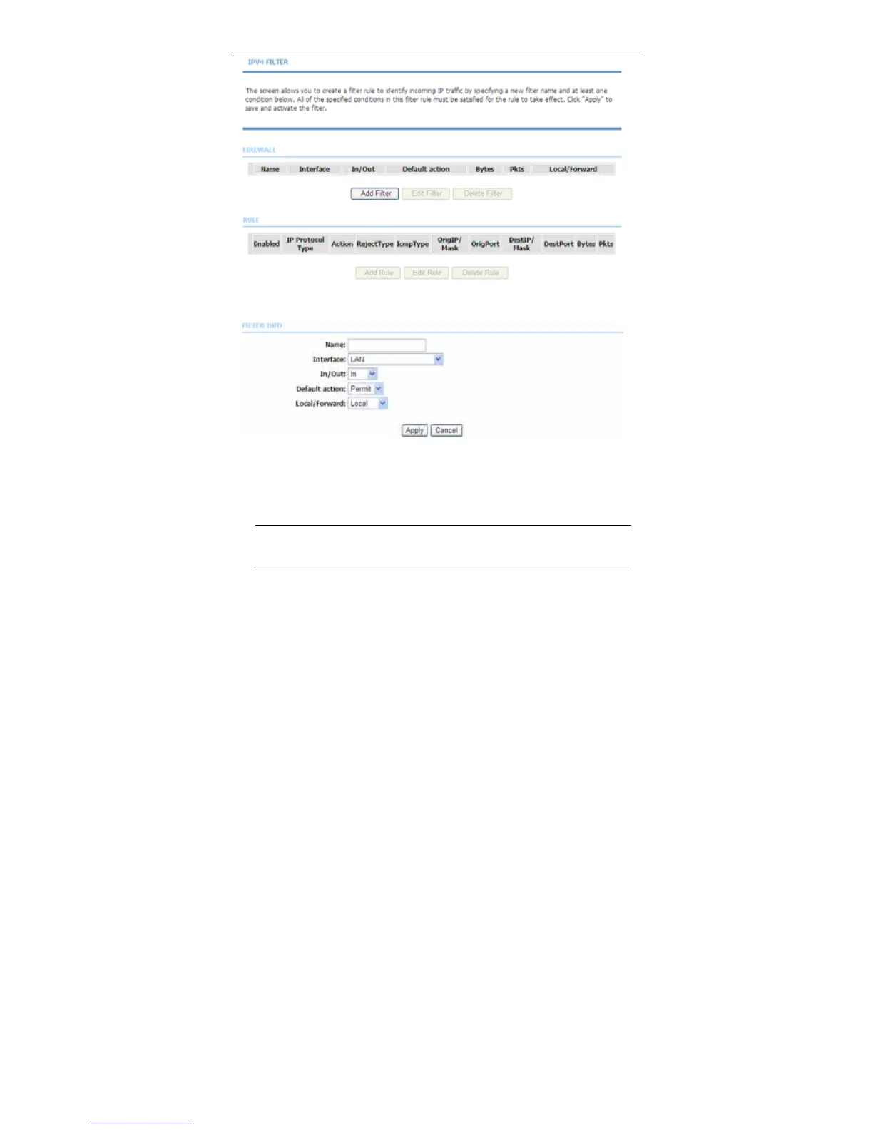 In/Out, Default action and Local/Forward.