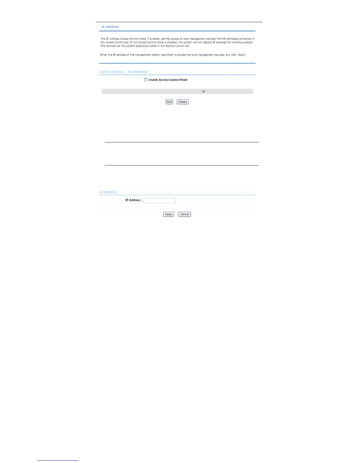 To add an IP address to the IP list, cick Add. The page shown in the following