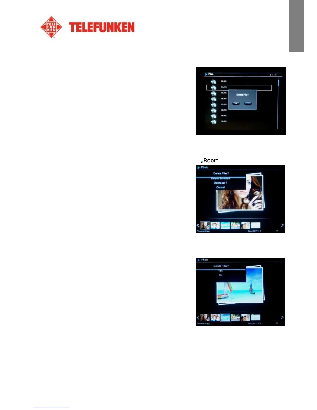 auf die Taste „Copy/Del“. Auf dem Bildschirm erscheint „Datei löschen? –Ja/Nein“. Wählen Sie