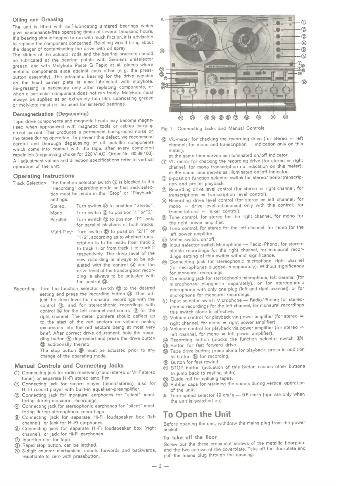 Telefunken M 204 E - Oiling and Greasing; Demagnetisation (Degaussing); Operating Instructions; Track Selection and Recording Procedure