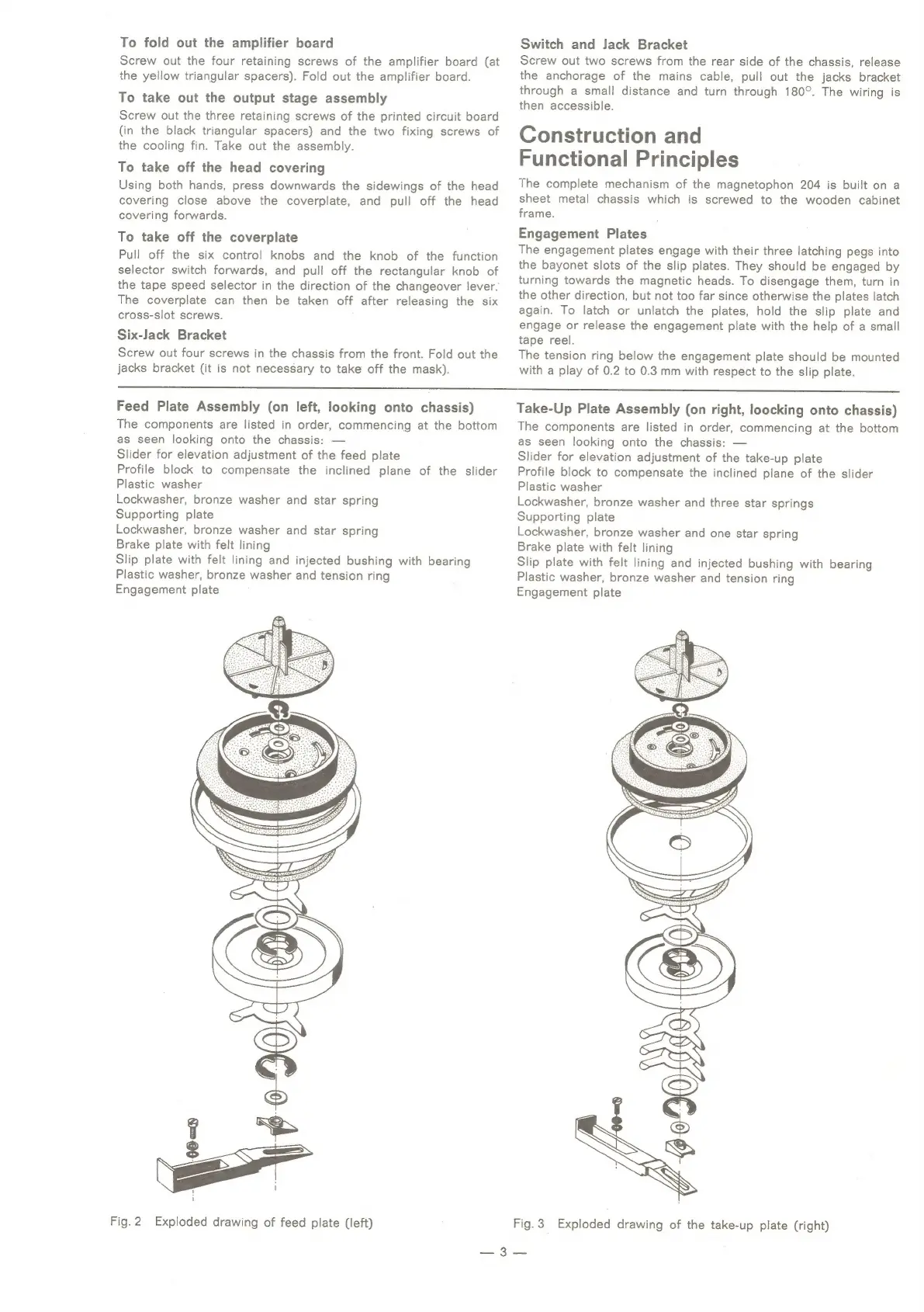 Telefunken M 204 E - Component Assemblies and Construction; Feed Plate, Switch;Jack Bracket, and Take-Up Plate Assemblies; Engagement Plates Mechanism