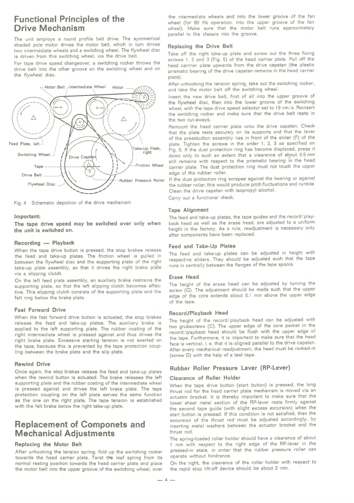 Telefunken M 204 E - Drive Mechanism Principles; Motor Belt Replacement; Tape Path Alignment Procedures; Feed;Take-Up Plates and Head Adjustments