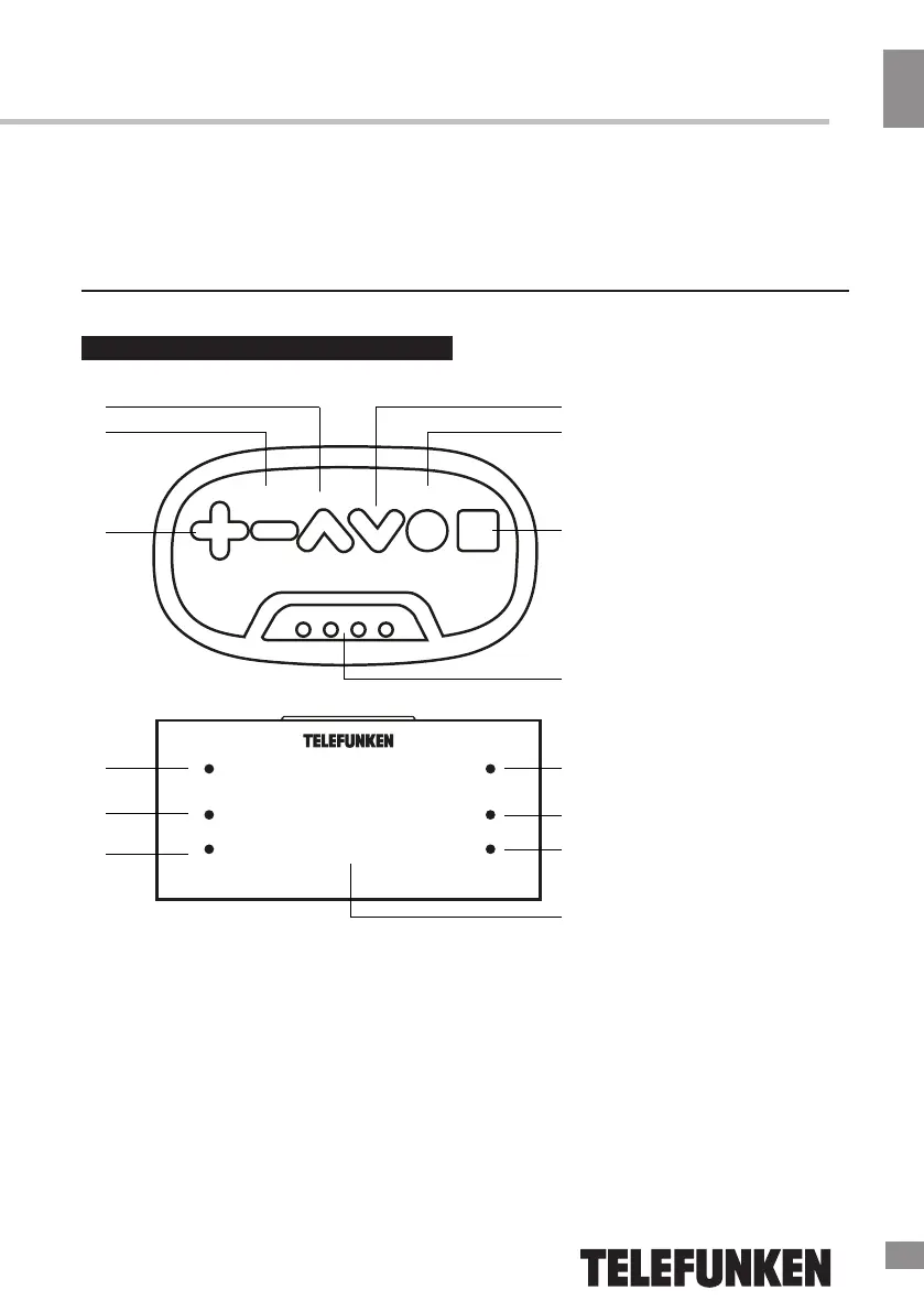 Not indicated: battery compartment (bottom), power cable (rear), FM wire antenna (rear).