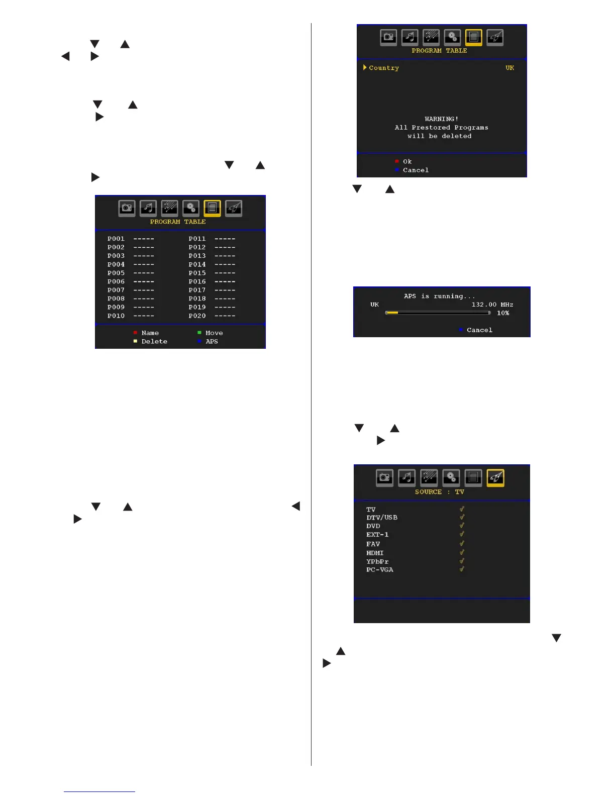 “ ” button. Source options are; TV, DTV/USB, DVD,