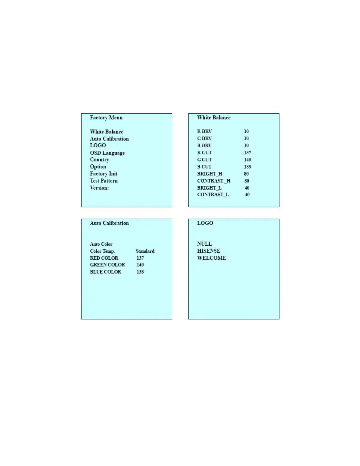 UP/DOWN, In this condition, press 0、5、3、2,you can enter factory menu.