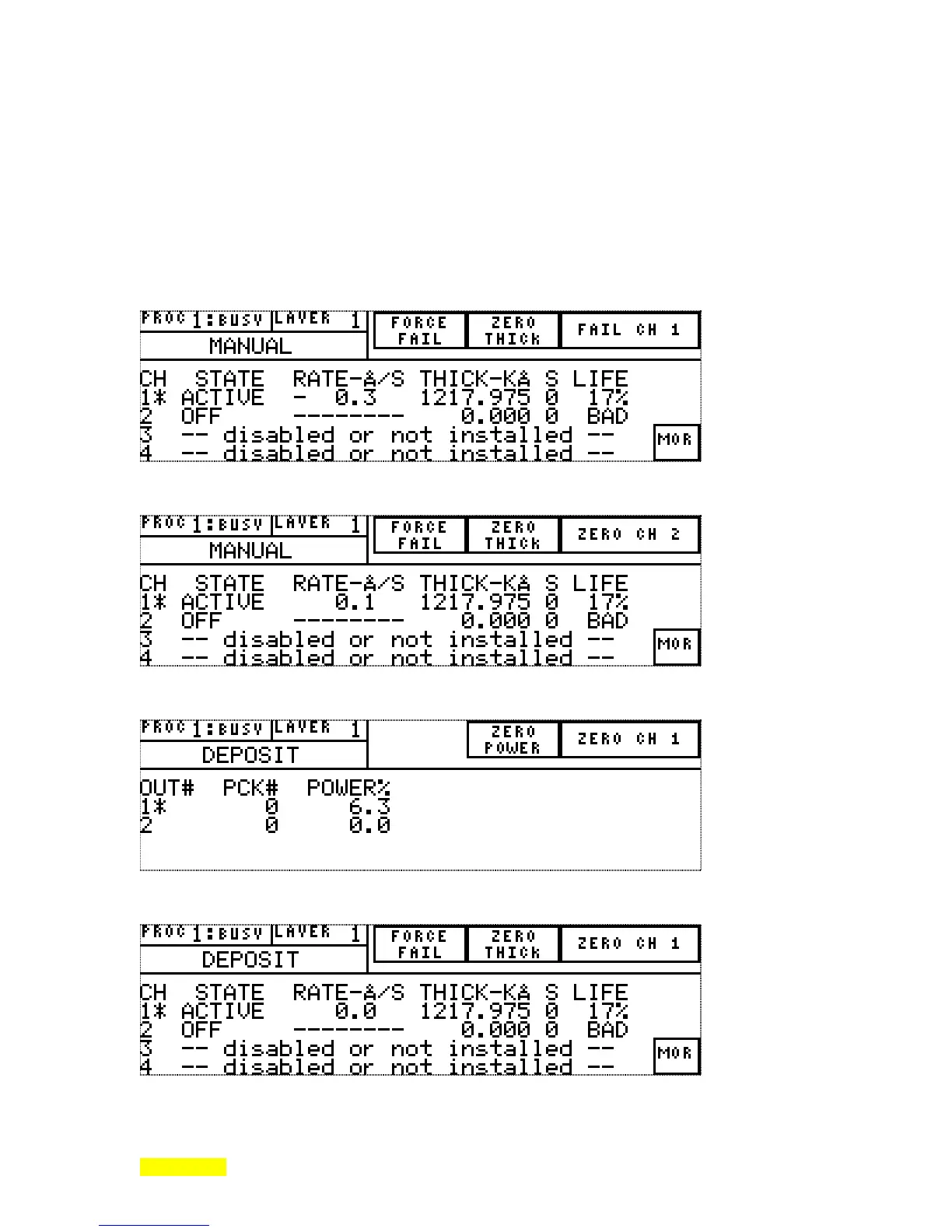 STATUS screen during a deposition when not in manual mode. The MORe key