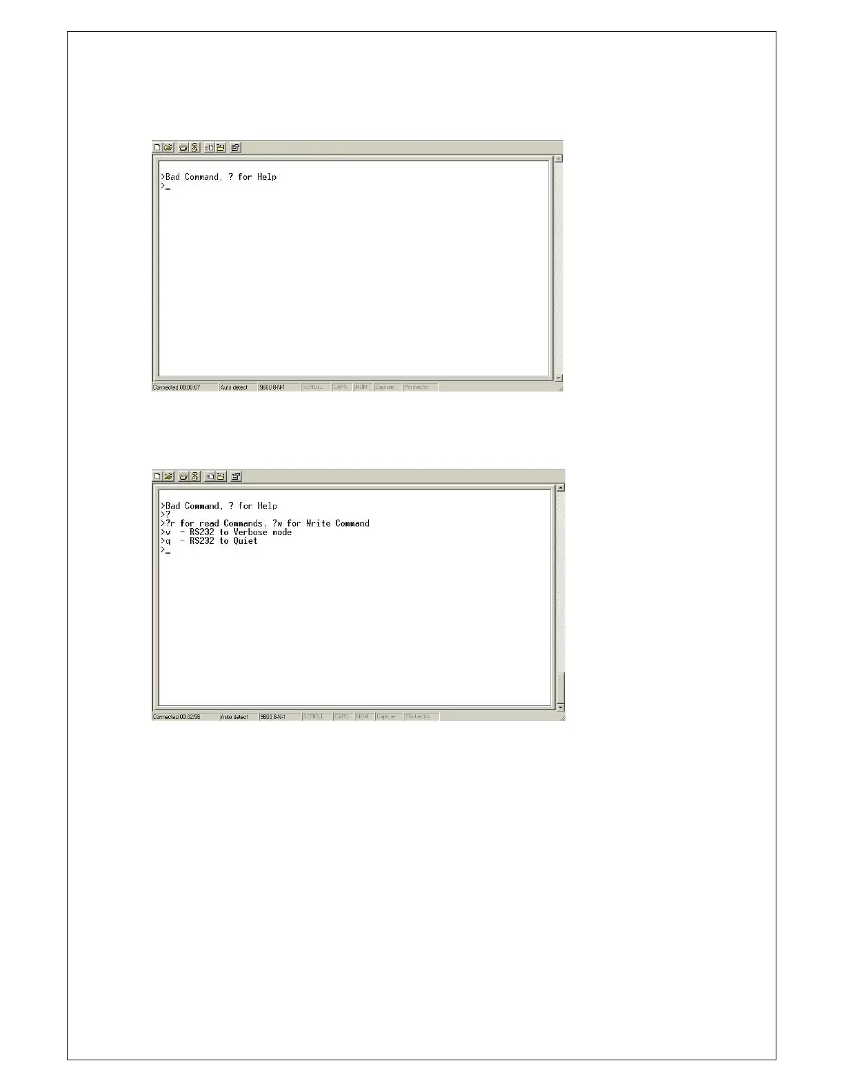 All commands must be executed as lower case characters followed by return. All commands