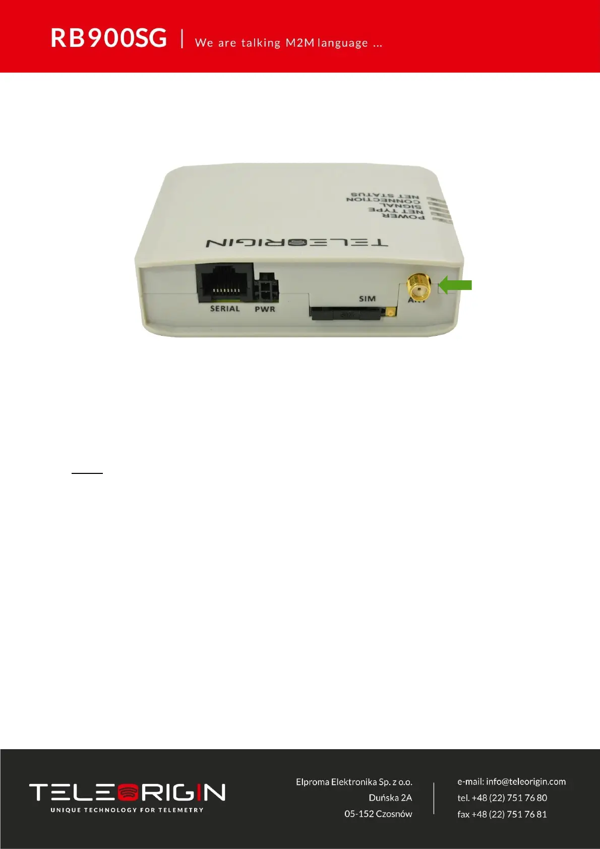 An SMA “ANT” input is used to connect external GSM/UMTS/LTE antenna. To establish