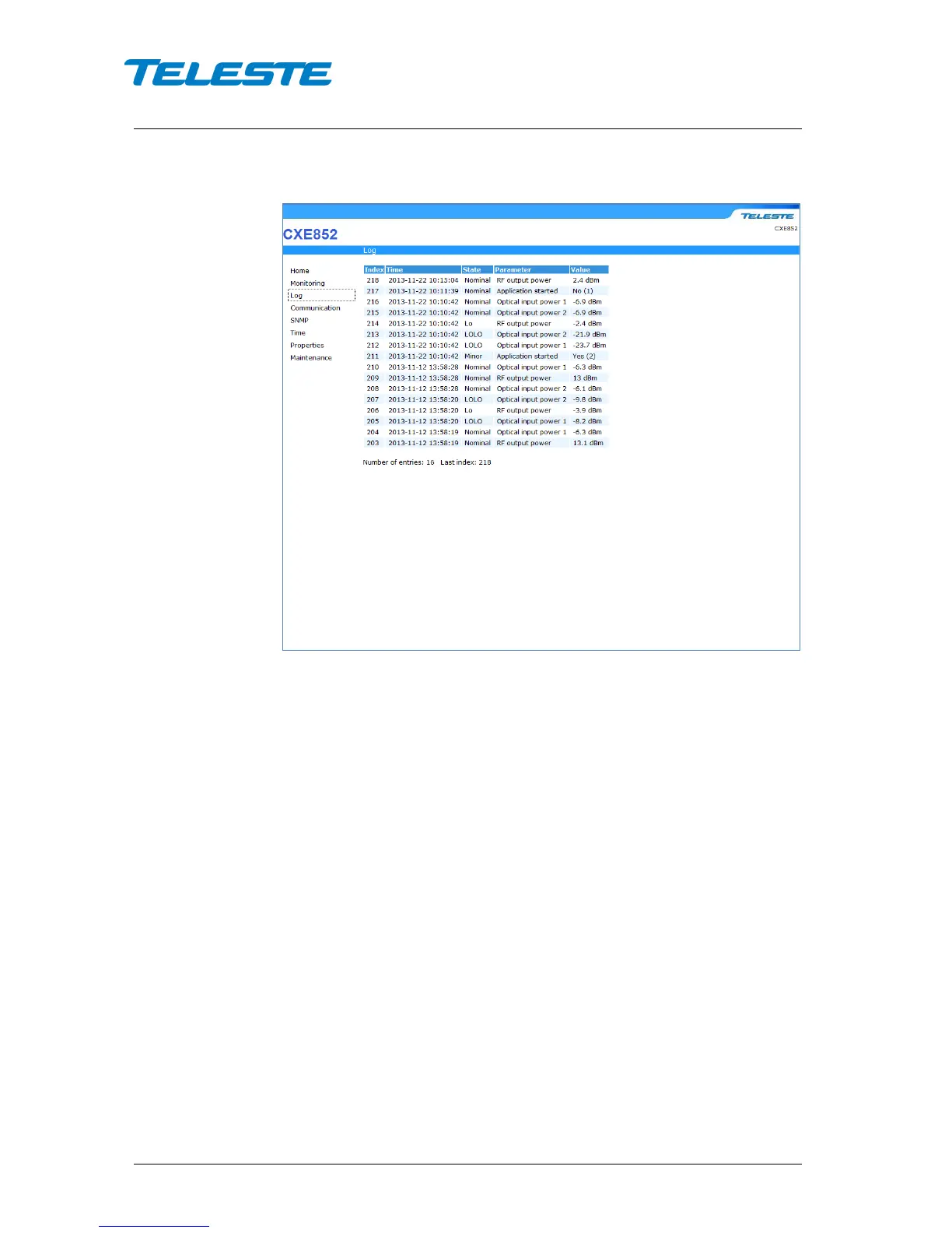 Teleste CXE851 - Log Webui Page